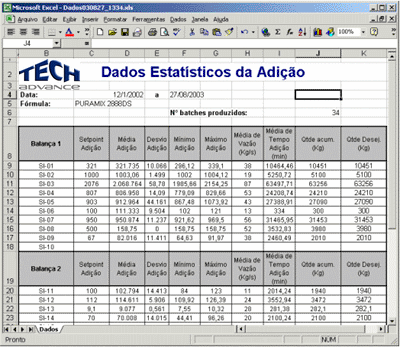 A tela principal do sistema, apresentada abaixo, informará os dados de cada matéria-prima adicionada para todas as bateladas da receita, com três tipos de informação: quantidades dosadas, vazão e tempo de adição. Apresentará também os dados estatísticos das matérias-primas e os setpoints e limites de especificação inferior e superior (as porcentagens para o cálculo dos limites são configuráveis).